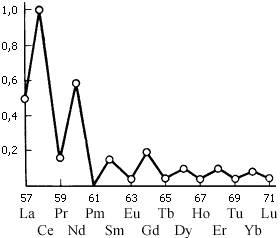 Рис. 4. Относительное содержание лантаноидов в земном коре. Закономерность: четные распространены больше нечетных