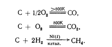 Углерод инертен, но при очень высокой, температуре (в аморфном состоянии) взаимодействует с большинством металлов с образованием твердых растворов или карбидов (СаС2, Fе3С и т.д.), а также со многими металлоидами, например: