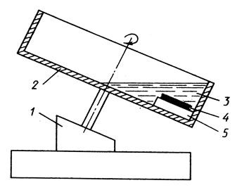 Принцип химико-динамического травления заключается в интенсивном перемешивании травителя непосредственно над поверхностью пластин (рис.4). При вращении приводом 1 фторопластового барабана 2 травитель 3 омывает пластины 4, закрепленные на специальном диске 5, чем достигается хорошее перемешивание травителя и равномерное травление.