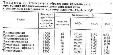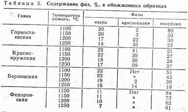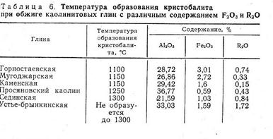 Фазовый состав кремнезёма в обожжённых глинах, а также температура образования кристобалита зависят от их химико-минералогического состава. Температура же образования кристобалита определяется в основном составом примесей, содержащихся в глинах (табл. 6).
