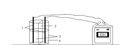 Рис.4. Электролиз раствора хлорида натрия с применением бумажной диафрагмы: 1 – стержни от карандаша; 2 – бумажная перегородка; 3 – раствор хлорида натрия; 4 – раствор фенолфталеина.