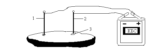 Рис.6. Электролиз раствора хлорида натрия в соленом огурце: 1 – медный электрод; 2 – железный электрод; 3 – фенолфталеиновая бумажка.