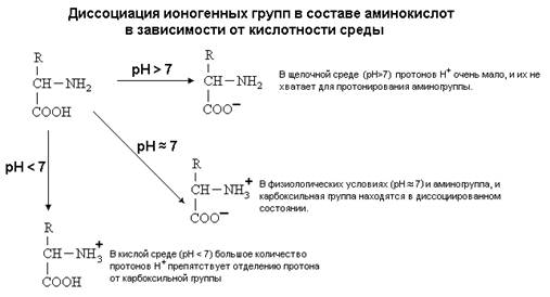 Такие свойства характерны для свободных аминокислот. В белке же ионогенные группы общей части аминокислот участвуют в образовании пептидной связи, и все свойства белка определяются только свойствами радикалов аминокислот.