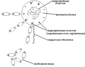 Чем больше гидрофильных свойств у белковой молекулы, чем больше в ее составе и на ее поверхности аминокислот с полярными (гидрофильными) радикалами, тем сильнее выражена и прочнее удерживается гидратная оболочка и тем больше в ней слоев. Вода гидратной оболочки обладает особыми свойствами: она не является свободной, а связана с белковой молекулой. Это - “связанная” вода. Она принадлежит белку, и поэтому имеет особые свойства.