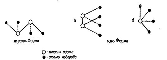 Если связи N—Н расположены в пространстве так, как это указано на рисунке, то очевидно, что цис-форма гидразина должна иметь два стереоизомера. Эти выводы подтверждают предположение, впервые высказанное Пенни и Сазерлендом, которые вычислили, что дипольный момент структуры, соответствующей несимметричной цис-форме, равен 1,70 дебая; они предположили также, что валентные углы N—N—Н и Н—N—Н составляют приблизительно 110°С. Электронографические исследования паров гидразина показывают, что углы Н—N—Н и Н—N—N приблизительно составляют 108±10°С. Межатомные расстояния равны: