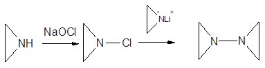Для сочетания двух атомов азота с образованием 1,1-бис-азиридина был использован циклический хлорамин, полученный из этиленимина, что иллюстрирует возможный путь синтеза других тетразамещенных гидразинов: