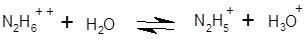 Величина второй константы ионизации настолько мала, что двузамещенные соли гидразина в водном растворе не существуют. Ионы N2H6+ + полностью реагируют с водой (растворителем) в соответствии с уравнением: