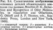 Структуру соединений, обладающих запахом, установить легко. Гораздо труднее определить, как эти соединения взаимодействуют с обонятельными рецепторами (рис. 9.4). Несомненно большую роль играет летучесть пахучего соединения, благодаря которой оно достигает обонятельных центров. Обычно недостаточно оценивается, насколько высокочувствительным может быть обоняние. Особенно сильно пахнущие вещества человек обычно может обнаружить при их содержании в количестве одна часть на 1012 частей воздуха. Даже незначительное число пахучих молекул, достигших рецепторного центра обоняния (рис. 9.4), адсорбируется на поверхности рецептора.