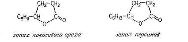 Твердо установлено также, что запах углеводородов существенно зависит от длины их цепи. Так, метан не имеет запаха; н-пентан имеет характерный запах жидкости для заправки зажигалок, а алканы типа октана и нонана — запах бензина. Известно, что сложные эфиры имеют фруктовый запах, однако специфический запах зависит от характера кислотного и спиртового компонентов, входящих в эфир. Очень интересные изменения запаха в зависимости от характера замещения наблюдаются для γ-лактонов: 5-н-пентилпроизводное имеет запах кокосового ореха, а 5-н-гексилпро-изводное пахнет персиками