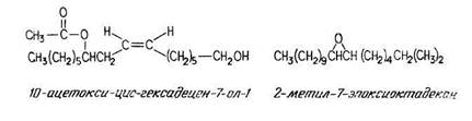 Структура этого соединения была установлена путем исследования его спектра и при помощи реакции химического разложения. В заключение, как и обычно, был проведен полный синтез вещества предложенной структуры и тщательное сравнение природного вещества и вещества, полученного, синтетическим путем. Так была установлена структура полового феромона Вотbух тоri.