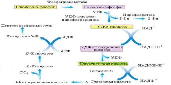Значение глюкуронового пути. В клетках организма глюкуроновая кислота используется для синтеза глюкозаминогликанов (гиалуроновой кислоты, хондроитинсульфатов, гепарина). УДФ-глюкуроновая кислота, связывая продукты метаболизма (например, стероидные гормоны) и чужеродные вещества (лекарственные препараты и другие ксенобиотики) в виде водорастворимых глюкуронидов легко экскретируется с желчью и мочой.