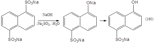 Введение достаточного количества воды в плав позволяет поддерживать реакционную массу в жидком состоянии при относительно низких температурах. Однако добавление воды в реакционную массу хотя не меняет основного направления реакции щелочного плавления, но резко снижает ее скорость. Поэтому водные растворы щелочи более удобно применять для частичной замены сульфогруппы в полисульфокислотах. Так получают из нафтплин-1,5-дисульфокислоты 5-гидроксинафталин-1-сульфокислоту (схема 11).