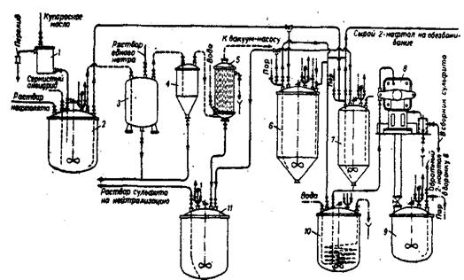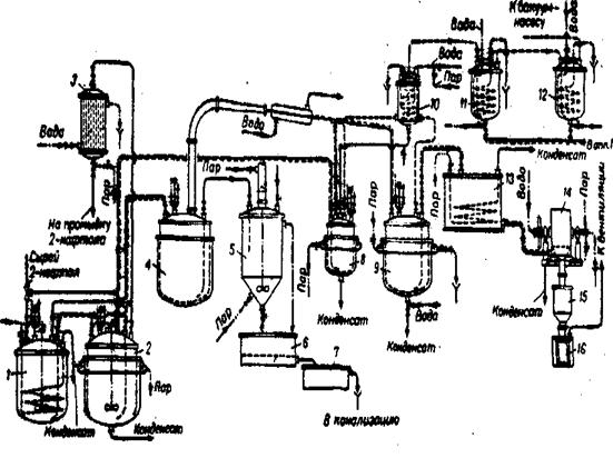 1 - сборник сырого 2 - нафтола; 2 -обезвоживатель, 3 - конденсатор-теплообменник; 4 - перегонный куб; 5 - гранулятор смолы; 6 - фильтр; 7 - отстойник сточных вод; 8-прнемник; 9 - приемник 2-нафтола; 10,11,12 - ловушки; 13 - напорный бак; 14 - барабанный кристаллизатор; 15 - бункер; 16 - вентилируемый шкаф для разгрузки 2-нафтола.