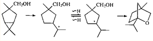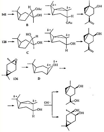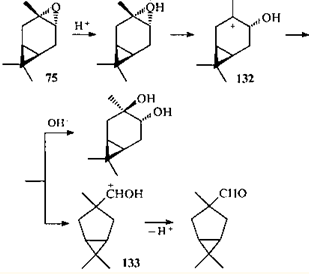 Такой подход объясняет общность превращений эпоксида 136 в условиях обычного кислотного катализа и в суперкислотах, но при этом возникают новые вопросы. Превращение зпоксида 75 в суперкислотах приводит к продуктам, предполагающим промежуточное образование иона 134, а сольволиз соединения 75 протекает без образования 1-метил-4-изопропилбицикло[3.1.0]гептановых структур. В качестве побочного продукта процесса происходит сужение цикла в результате алкильного сдвига в ионе 132, что приводит к иону 133, который стабилизируется путем выброса протона; в суперкислоте ион 133 подвергается перегруппировке.125, 130