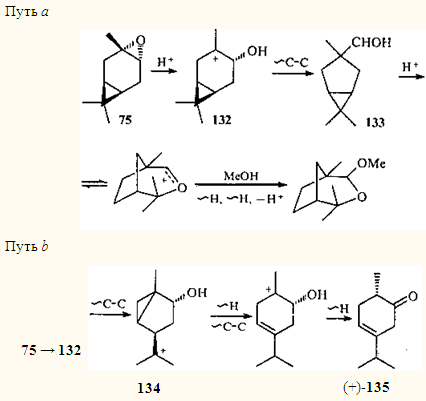 В ионе 4-гидроксикарана 132 должен произойти 1,2-алкильный сдвиг, вызывающий сужение шестичленного цикла с образованием иона 133; выброс протона и ионизация ЦПК создают возможность циклизации (путь а).