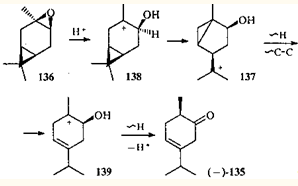 Для объяснения перегруппировок β-цис-3,4-эпоксикарана (136) в суперкислотной среде предложен механизм с участием бициклического иона 137, изомерного иону 134.118 В этом случае стереоспецифично образуется кетон (—)-135, который является не только стереоизомером, но и энантиомером кетона (+)-135, получающегося в процессе перегруппировок эпоксида 75.