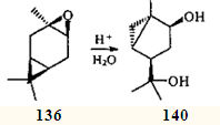 Приведенные выше схемы превращений эпоксидов 75 и 136 рассматривают лишь наиболее вероятные пути образования конечных продуктов. Соединения, имеющие углеродный скелет 1-метил-4-изопропилбицикло[3.1.0]гексана, которые могли бы получаться из ионов 134 и 137, среди продуктов превращения эпоксикаранов в суперкислотной среде не найдены. Однако в 1962 г, при кислотной гидратации цис-эпоксида 136 был получен диол 140 с таким же скелетом,119 и в 1972 г. была подтверждена его структура.120