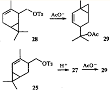 Тут уместно привести чрезвычайно интересный факт: 2-тозилоксиметил-3-карен (28) при ацетолизе дает тот же эфир 29, что и 4-тозилоксиметил-2-карен (25).36