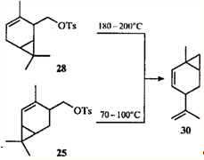 Механизм образования ацетата 29 пока не выяснен. Обращает внимание также отсутствие продуктов, образования которых можно было бы ожидать, опираясь на данные по превращениям эфира 25. Известно еще одно достаточно необычное превращение тозилата 28: при пиролизе он дает тот же углеводород, что и тозилат 25, а именно 1-метил-4-изопропенилбицикло[4.1.0]гепт-2-ен (30).36