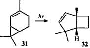Радикальные перегруппировки монотерпеноидов каранового ряда происходят, как правило, при фотохимических реакциях. Фотохимические превращения таких соединений достаточно подробно описаны в обзоре 12. Для 3-карена перегруппировки в условиях облучения не наблюдались. Известно лишь его фотохимическое окисление с образованием трех гидропероксидов.39 Изомерный 2-карен при облучении в присутствии сенсибилизатора перегруппировывается в 1,4,4-триметилбицикло[3.2.0]гепт-2-ен (32), который был использован для синтеза грандизола.4