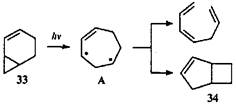 В данном случае механизм перегруппировки не рассматривался, но в литературе описан механизм для родственного соединения — 2-норкарена (33).40 При облучении соединения 33 основным продуктом был цис-гепта-1,3,6-триен, т.е. преобладал [2π+2ω+2σ]-процесс. Образование небольшого количества бицикло[3.2.0]гепт-2-ена (34) позволило авторам предложить общий дирадикальный интермедиат А с семичленным циклом: