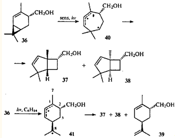 Косвенным подтверждением согласованного механизма перегруппировки кетона 35 можно считать результаты облучения 4-гидроксиметил-2-карена (36) ртутной лампой высокого давления:42 в присутствии сенсибилизатора (sens) образуются только бициклические стереоизомерные спирты 37 и 38, а при прямом облучении в гексане — еще и моноциклический спирт 39.