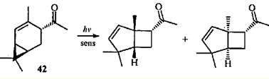 Облучение 4-ацетил-2-карена (42) в присутствии сенсибилизатора дает продукты с бицикло[3.2.0]гептановой структурой,43 т.е. замена гидроксиметильной группы на ацильную не влияет на механизм реакции.