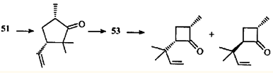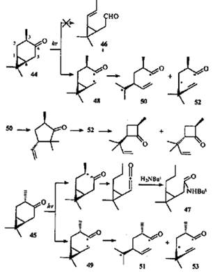 Формально фотохимическое поведение кетонов 44 и 45 очень похоже на аллильные перегруппировки β,γ-ненасыщенных кетонов.45 Кропп с соавторами считал фотохимическую перегруппировку каранонов 44 и 45 первым примером циклопропильного аналога фотохимической аллильной перегруппировки.44 Однако в случае β,γ -ненасыщенных кетонов реакция обратима, а в случае кетонов 44 и 45 — нет.