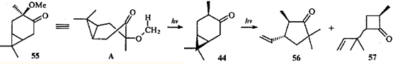 Направление скелетной фотохимической перегруппировки терпеноидов ряда карана зависит от ориентации заместителей: прямое облучение транс-3-метокси-4-каранона (54) в этаноле протекает с раскрытием шестичленного цикла по связи С(3)—С(4) (что для β,γ-циклопропилкетонов бывает крайне редко) и присоединением этанола.39