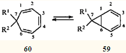 Одно из интереснейших скелетных превращений карановых структур — перегруппировки, связывающие терпеноиды ряда карана и ряда 1,1,4-триметилциклогептана, — привлекло внимание исследователей и привело к открытию такого замечательного явления в органической химии, как "быстрое" равновесие норкарадиен - циклогептатриен. Этой теме посвящено большое количество работ последней трети двадцатого века.47-55 Быстрое равновесие валентных таутомеров норкара-2,4-диена (59) и циклогепта-1,3,5-триена (60) обусловлено типично согласованной реакцией — дисротаторным раскрытием и замыканием трехчленного карбоцикла, причем этот процесс подчиняется правилам сохранения орбитальной симметрии, сформулированным Вудвордом и Гофманом.56