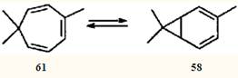 Экспериментально установлено, что бициклическую структуру способны стабилизировать π-акцепторные заместители в положении 7.55 Природу такой стабилизации изящно объяснил Р.Гофман в рамках метода граничных МО.53 Очевидно, что метальные заместители стабилизаторами быть не могут, и поэтому для системы 2,4-карадиен (58) — 3,7,7-триметилциклогепта-1,3,5-триен (61) равновесие всегда сдвинуто в сторону моноциклического партнера. Однако эти валентные таутомеры — все-таки разные, реально существующие соединения; они обладают различной реакционной способностью, что должно проявляться (и проявляется, как будет показано ниже) в химических реакциях.