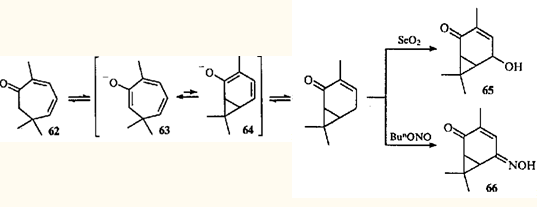 Гипотеза о валентной таутомерии моно- и бициклических енолов 63 и 64, как возможное объяснение скелетной перегруппировки кетона 62 при образовании 3,7,7-триметил-5-гидрокси-3-карен-2-она (65) и 3,7,7-триметил-5-оксиимино-3-карен-2-она (66), была выдвинута в 1956 г.61,62 Впоследствии оказалось, что гораздо более распространенными являются перегруппировки карановых производных в триметилциклогептановые, поскольку равновесие в динамическом взаимопревращении двух таутомеров сильно сдвинуто в сторону моноциклического партнера.63
