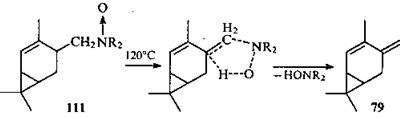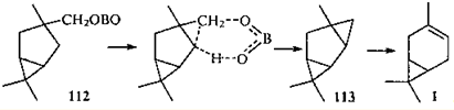 Борный эфир 112, в котором заведомо невозможно 1,2-элиминирование, пиролизуется с образованием 3-карена (1). Предполагают, что последний образуется в результате кислотной изомеризации первоначального продукта пиролиза — трициклического углеводорода 113. Ни один из опробованных в этой реакции эфиров 3,6,6-триметилбицикло[3.1.0]гекс-3-илметанола (тозилат, ацетат, амино- и хлорацетаты) не вел себя подобным образом.