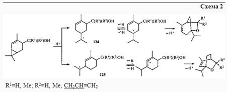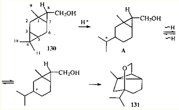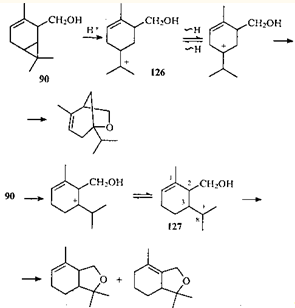 Циклизация диола 128 происходит без предварительного водородного сдвига через п-ментановый ион 129, в котором атом кислорода находится ближе к заряженному атому углерода, чем в ионе 126. При этом происходит селективное раскрытие циклопропанового кольца по связи С(1)—С(7); причина такой селективности пока не выяснена.36