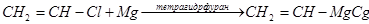 3. Синтез винильных магнийорганических соединений в тетрагидрофуране. Долгое время были безуспешными попытки синтеза магнийорганических соединений с винильными радикалами из галогенвинилов и магния. Причиной этих неудач была незначительная подвижность галогенов при двойной связи. Однако применение в качестве реакционной среды тетрагидрофурана, а также тетрагидропирана, этиловых и дибутиловых эфиров этиленгликоля позволило осуществить эту реакцию (Г. Норман, 1954 г.):