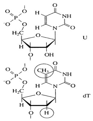 Рис.4. Химические формулы остатков одного из рибонуклеотидов – уридиловой кислоты (U) и гомологичного ему дезоксирибонуклеотида тимидиловой кислоты (dT)