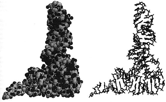 Рис. 5. Атомная (слева) и скелетная (справа) модели фенилаланиновой т-РНК дрожжей