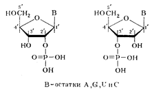 Более сложным оказался вопрос о природе межнуклеотидной связи в РНК. Уже на первых этапах изучения строения РНК был установлен факт чрезвычайной неустойчивости се при щелочном гидролизе. Основными продуктами щелочного гидролиза РНК являются рибонуклсозид-2'- и рибонуклеозид-З'-фосфаты, образующиеся практически в равных количествах.