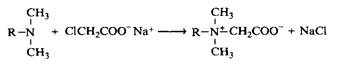 Типичными представителями цвиттер-ионных ПАВ являются N-алкилпро-изводные простых аминокислот, бетаина 2NCH2COOH), аминопропионовой кислоты). Такие ПАВ получают не из аминокислот, а по реакции длинноцепочечных аминов с хлорацетатом натрия или с производными акриловой кислоты, при этом образуются структуры с одним или двумя атомами углерода соответственно между азотом и карбоксилатной группой. В качестве примера ниже приведена схема реакции получения типичного ПАВ — производного бетаина из алкилдиметил-амина и монохлорацетата натрия: