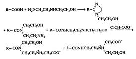 Другой тип цвиттер-ионных ПАВ, обычно называемых имидазолинами, синтезируют по реакции жирной кислоты с аминоэтилэтаноламином с последующей обработкой хлорацетатом. Номенклатура ПАВ этого типа оказалась немного запутанной, поскольку полагали, что конечный продукт содержит имидазольное кольцо, но позже было установлено, что пятичленное кольцо разрывается на второй стадии синтеза. Типичная последовательность реакций такова:
