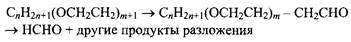 К сравнительно мягким ПАВ относятся этоксилаты спиртов, но они уступают по мягкости воздействия на кожу неионным ПАВ на основе многоатомных спиртов, например алкилглюкозидам. Исследования последних лет показали, что дерматологические эффекты этоксилатов спиртов вызываются не самим ПАВ, а продуктами его окисления, происходящего в процессе хранения. Обнаружено, что все этоксилированные продукты претерпевают автоокисление с образованием гидропероксидов на метиленовых группах, связанных с эфирным кислородом в полиоксиэтиленовых цепях. Такие гидропероксиды не очень устойчивы, что затрудняет их выделение. Однако гидропероксид с ООН-группой у второго атома углерода гидрофобного «хвоста» относительно стабилен и был выделен в количестве ~1% после хранения «-алкилэтоксилата в течение года. Это вещество оказывает сильное раздражающее действие на кожу. Другой продукт окисления с аналогичным действием на кожу — альдегид, показанный ниже. Этот альдегид нестабилен, и его дальнейшее окисление приводит к разрыву полиоксиэтиленовой цепи и образованию формальдегида и других продуктов. Оба альдегида оказывают раздражающее действие на кожу и глаза:
