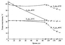 Чтобы контролировать автоокисление этоксилированных спиртов, полезно измерять изменение точки помутнения во времени. На рис. 12 приведены примеры такого теста для С12Е5 и С12Е6. Из рисунка видно, что оба НПАВ обнаруживают резкое уменьшение температуры помутнения при хранении при 40°С вследствие автоокисления.