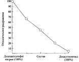 Влияние ПАВ на кожу часто определяют, используя тест с модифицированной камерой Дюринга. На рис. 13 приведены типичные результаты такого теста для додецилсульфата натрия, децилглюкозида и их смеси. Раздражающее действие на кожу уменьшается практически линейно с увеличением в смеси глюкозидного ПАВ. В других случаях уже небольшие добавки мягкого ПАВ могут вызывать весьма существенное улучшение дерматологических свойств композиций: такой синергетический эффект, возможно, связан с сильным снижением ККМ композиции из-за образования смешанных мицелл. Некоторые амфотерные ПАВ чрезвычайно сильно снижают раздражение кожи, вызванное контактом с анионными ПАВ, например эфирами алкилсульфатов. Эффект можно связать с протонированием карбоксильных