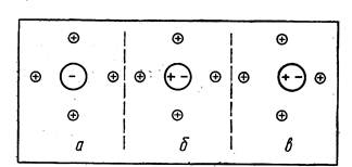 Перемену цвета, вызванную изменением состояния электронов и связанную с перестройкой структуры, можно объяснить колебательным движением в кристалле. Допустим, что частицы в кристалле закреплены неподвижно. В таком случае каждая из них испытывала бы строго симметричное влияние (рис. 8, а). Появляющаяся деформация от разных соседей компенсировала бы друг друга, В действительности же в кристалле непрерывно совершаются колебательные движения. Расстояния между частицами при таких колебаниях меняются, вызывая соответственно изменение распределения зарядов — поляризацию (рис. 8, б). Если поляризующее действие соседей и собственная деформируемость ионов или атомов достаточны, то это скажется на состоянии электронов, которые будут уже воспринимать кванты видимого света.