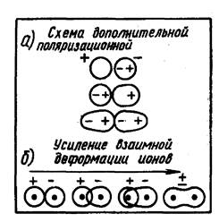 Рис. 10. Возникновение поляризационного эффекта (а) и усиление (б) взаимной деформации ионов.