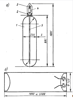 1 — стальной корпус; 2 — кольцо горловины; 3 — колпак; 4 — запорный вентиль; 5 — сифонная трубка