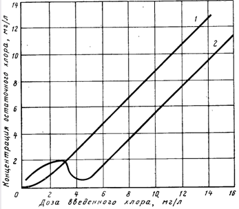 Рис. 14.4. Зависимость остаточного хлора от дозы введенного в воду при отсутствии (1) и при наличии (2) в ней аммонийных солей