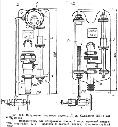 Вакуумные хлораторы системы Л. А. Кульского показаны на рис. 14.6 — хлоратор ЛК-11 средней производительности (рис. 14.6,а) для расхода хлора в пределах 0,5 . 4,5 кг/ч и хлоратор ЛК-10 малой производительности (рис. 14.6,6), рассчитанный на расход хлора в пределах 40 . 800 г/ч.