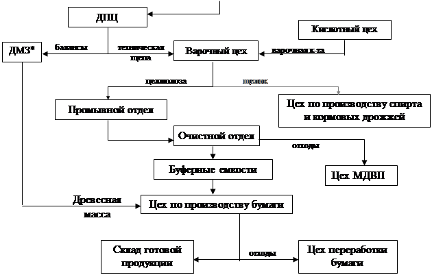 склад сырья, ДПЦ (древесноподготовительный цех), кислотный цех, варочный цех, цех по производству бумаги, спиртодрожжевой цех, склады готовой продукции. На схеме 1 показана взаимосвязь этих подразделений в производстве бумаги.