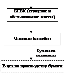 Производство бумаги показано на схеме 3. Жидковолокнистая масса, содержащая 2,5-3% целлюлозы из массного бассейна идет на размол. Полученная жидкая однородная суспензия целлюлозы поступает на составление композиций различных видов бумаги путем добавления древесной массы, а также клея (для придания водоотталкивающих свойств, для повышения сил связи между волокнами, придания бумаге жесткости и звонкости), глинозема (для закрепления клея на волокне, повышения удерживаемости мелкого волокна и наполнителя), наполнителей, таких как каолин, мел и др. (для улучшения печатных свойств бумаги, повышения гладкости) и лоска после каландирования, повышения непрозрачности и снижения себестоимости) и красящих веществ (для устранения нежелательных серых, желтых тонов в бумаге, для окраски и подцветки). Составленная композиция бумажной массы аккумулируется в бассейне, откуда поступает на бумагоделательные машины.